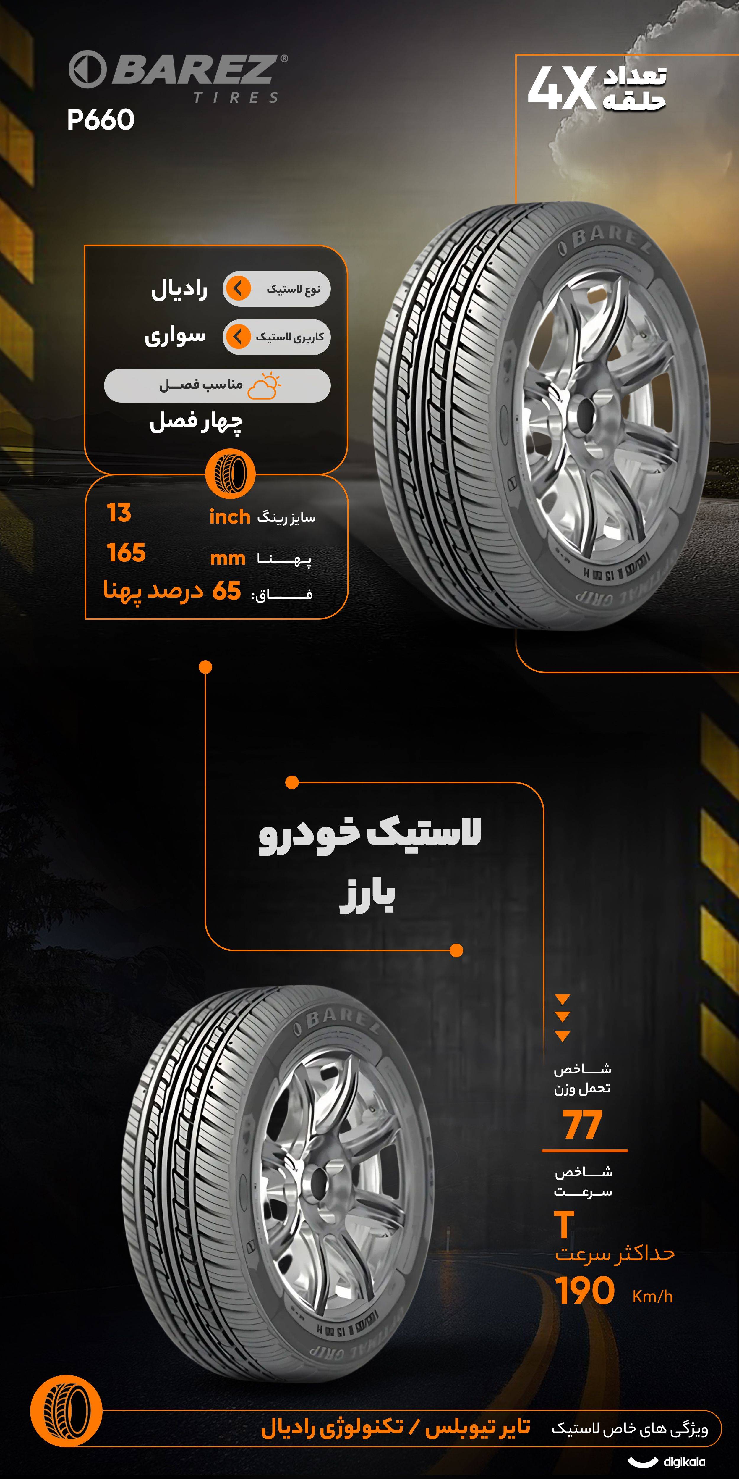 لاستیک خودرو بارز مدل P660 سایز 13 / 65 / 165 میلیمتر تولید سال 2025 - 4 حلقه