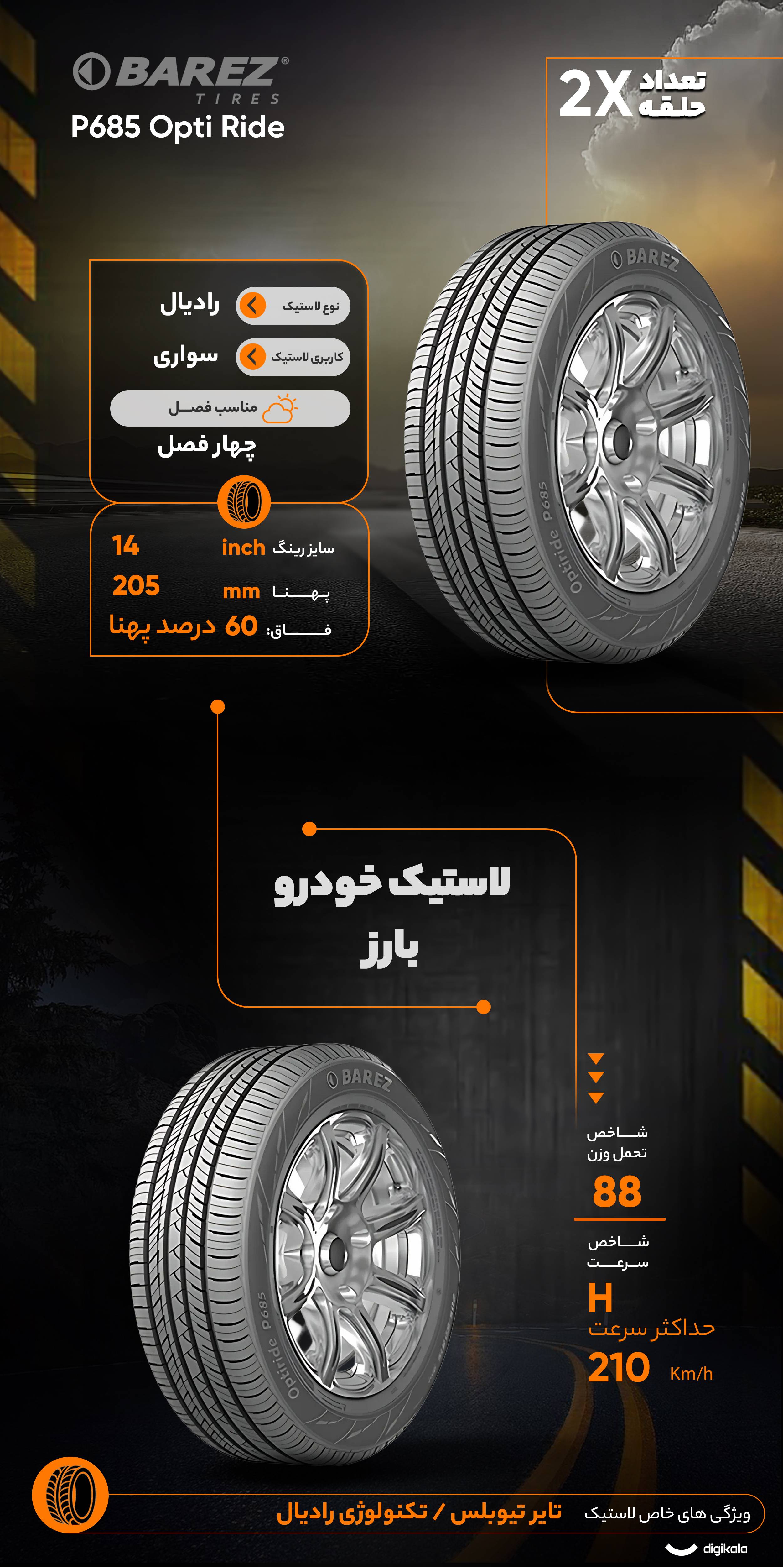 لاستیک خودرو بارز مدل P685 Opti Ride سایز 14 / 60 / 205 میلیمتر تولید سال 2025 - 2 حلقه