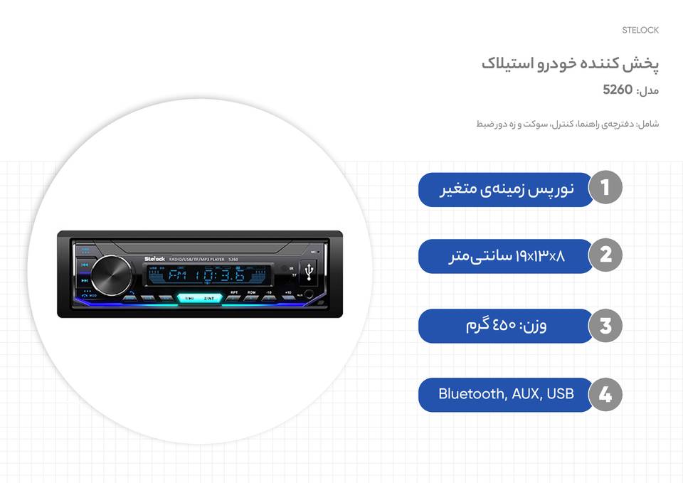 از جمله ضبط ماشین باکیفیت می‌توان به پخش کننده خودرو استیلاک مدل 5260 اشاره کرد. این ضبط دارای صفحه نمایش رنگی و ال سی دی هفت رنگ بوده و پنل آن از نوع ثابت است. از جمله مهم‌ترین ویژگی‌های ضبط ماشین 5260 می‌توان به قابلیت ارتباط صوتی آن اشاره کرد که در زمانی که تلفن شما از طریق بلوتوث به ضبط متصل باشد، این امکان برای شما فراهم می‌شود؛ درواقع ضبط استیلاک دارای میکروفون است. این مدل ضبط استیلاک دارای قابلیت بلوتوث است و از هر دو سیستم عامل اندروید و ios پشتیبانی می‌کند. هم‌چنین ...بیشتر